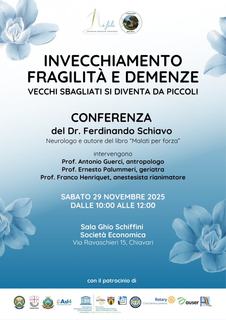 Il Dr. Ferdinando Schiavo, neurologo e autore del libro “Malati per forza”, ci illustrerà le essenziali conoscenze scientifiche, neurologiche in particolare, in tema di salute rivolgendosi a tutti i cittadini, professionisti della cura, familiari, care-viver, con l’obiettivo di contribuire a raggiungere una vecchiaia autonoma attraverso scelte responsabili.